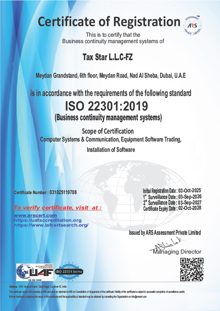 Tax Star is certified under ISO 22301:2019 for business continuity management.